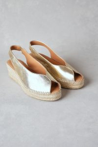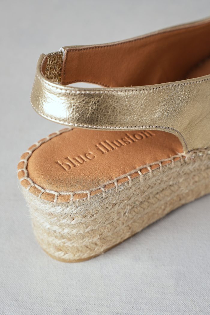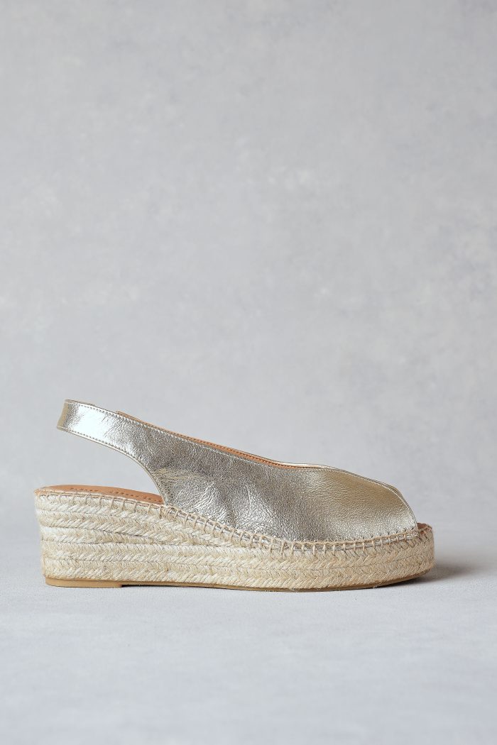 Adding a touch of shimmer to a summer classic, this gold leather espadrille brings understated glamour to your warm-weather wardrobe. The peep toe and elasticated slingback make it as easy to wear as it is to love.